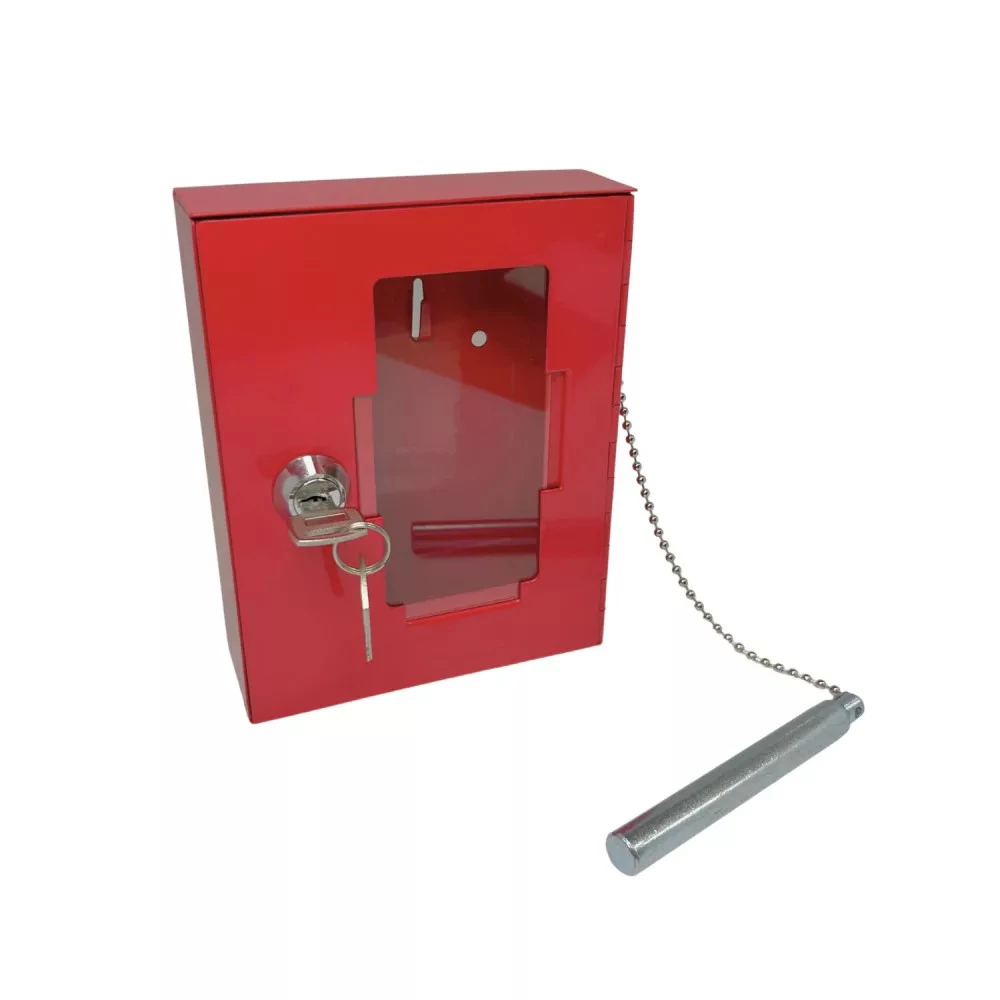 A tűzkulcsszekrény vészhelyzetben használandó kulcsok biztonságos tárolására szolgál. A piros színű, falra szerelhető fémszekrény kis méretének köszönhetően könnyen elhelyezhető, és tartalmaz egy kalapácsot az üveg betöréséhez vész esetén.